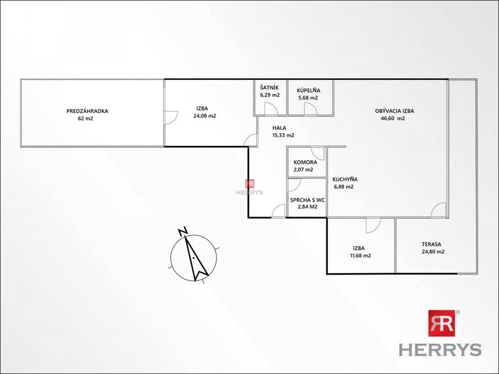usable area 204,43 m2 (floor area 121,63 m2 + terrace 24,80 m2 + predzáhradka 62 m2)