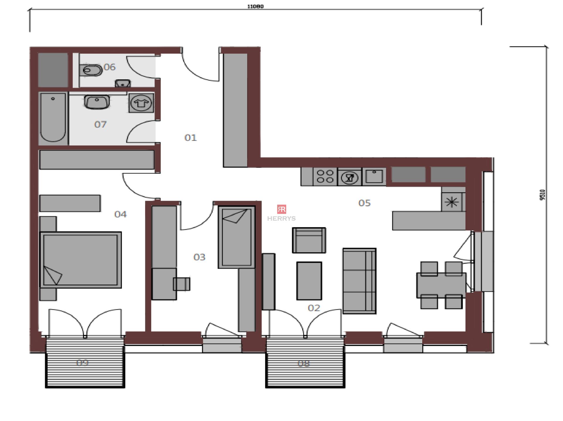 Byt pozostáva z priestrannej predsiene, z ktorej sa vchádza do kúpeľne s vaňou a samostatného WC, z obývacej miestnosti s kuchynským kútom a z dvoch izieb. Obývacia miestnosť aj spálňa majú výstup na svoj vlastný balkón.