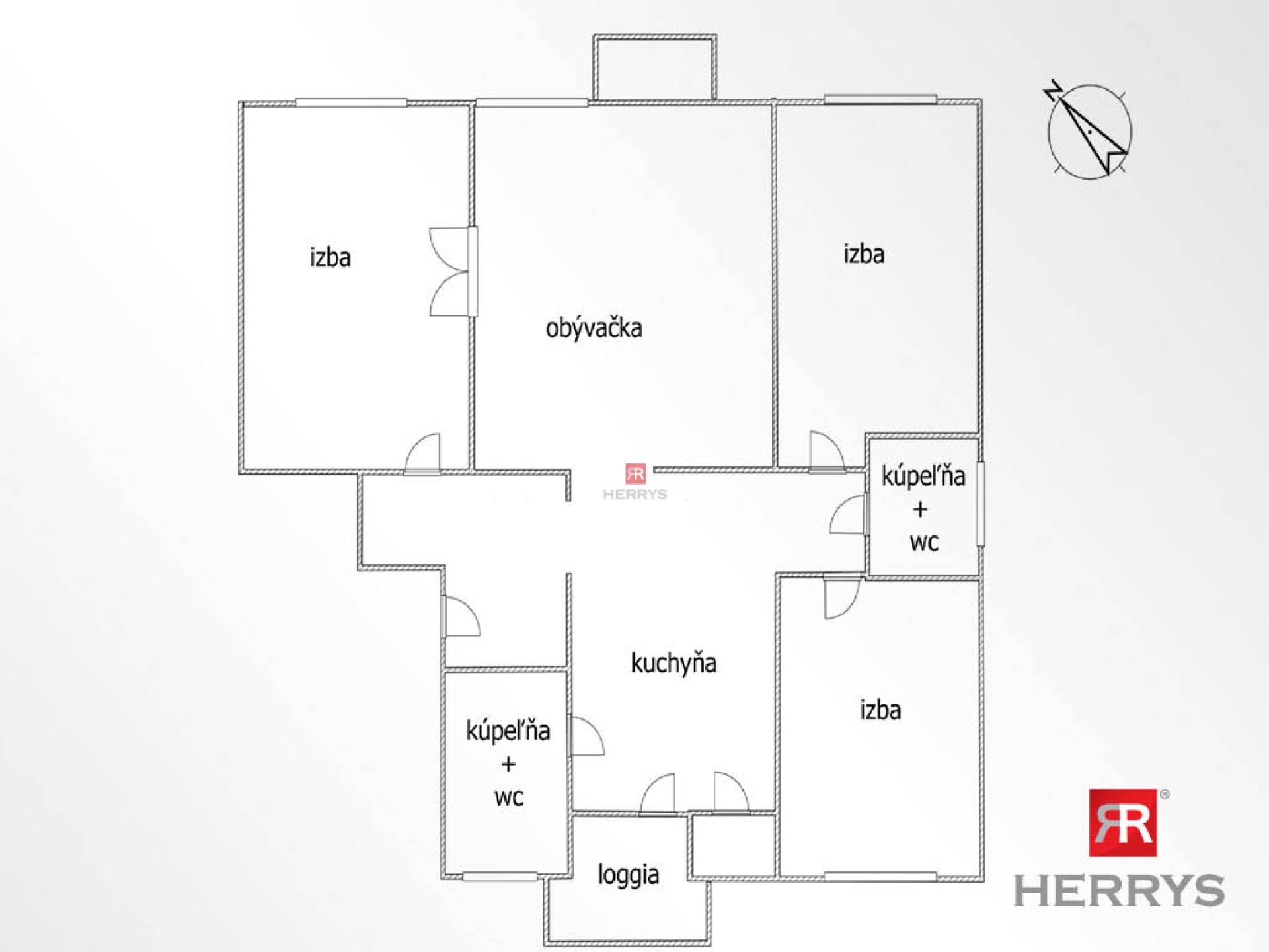 Vstupná chodba so vstavanou skriňou a odkladacím priestorom, tri nepriechodné izby, obývacia izba s výstupom na balkón, kuchyňa s výstupom na lodžiu, dve kúpeľne s WC.