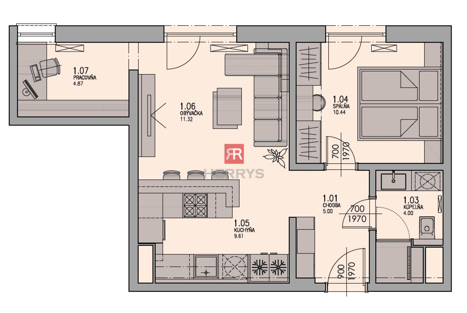 Byt pozostáva zo vstupnej chodby, z ktorej je prístup do kúpeľne so sprchovacím kútom a WC, vybavenej vaňou. Dominantou priestoru je obývacia izba prepojená s kuchynským kútom a menšou izbou, ktorá slúži ako pracovňa alebo polizba s variabilným využitím. Spálňa poskytuje príjemné súkromie s dostatočným priestorom vďaka vstavaným skriniam. Z obývacej izby aj spálne je priamy vstup na veľkorysú loggiu.