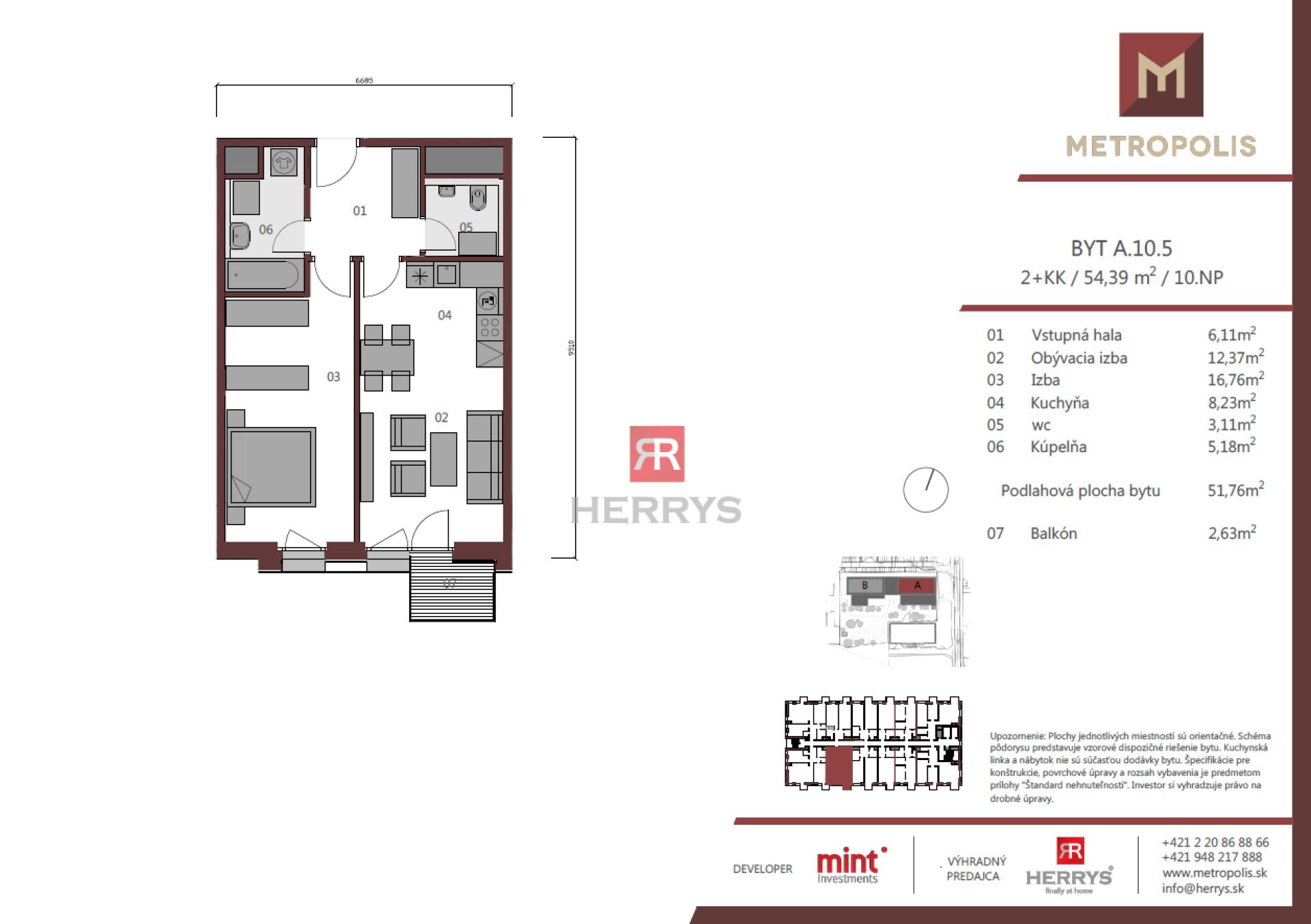 Byt pozostáva zo vstupnej chodby s priestorom na vstavanú skriňu, samostatnej toalety, kúpeľne s vaňou, obývacej izby prepojenej s kuchyňou a výstupom na balkón a zo samostatnej spálne.